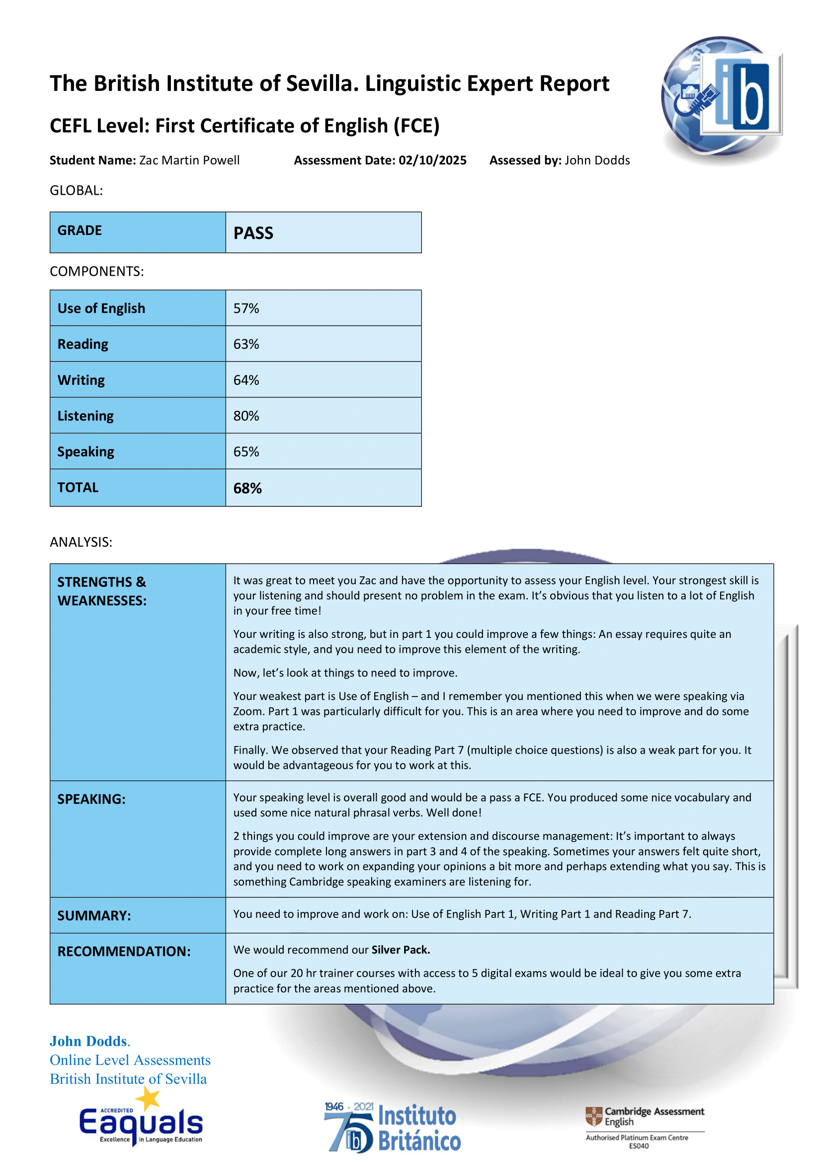 Expert Recommndations. The report will summerise your English level and tell you which of our courses would be suitable for you.